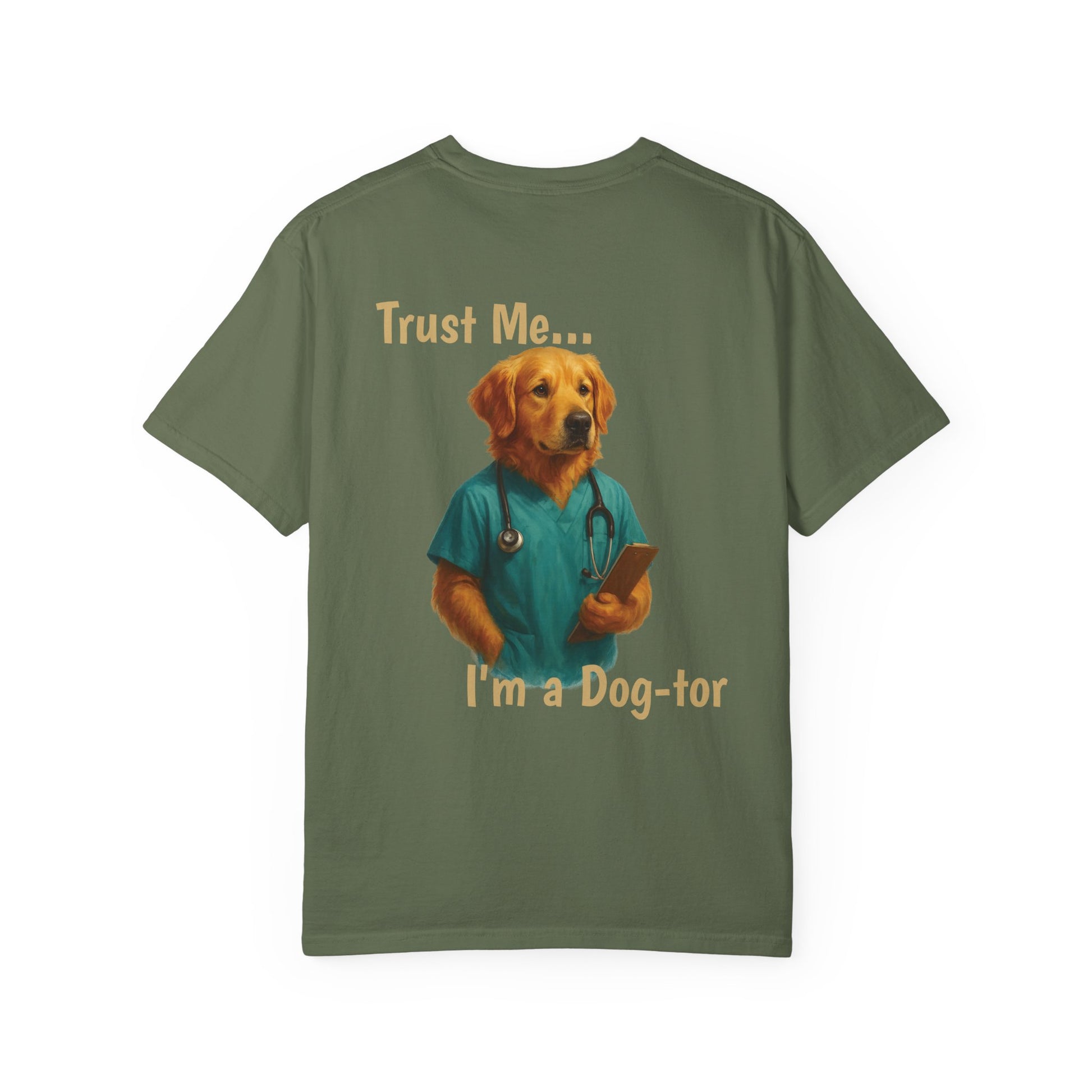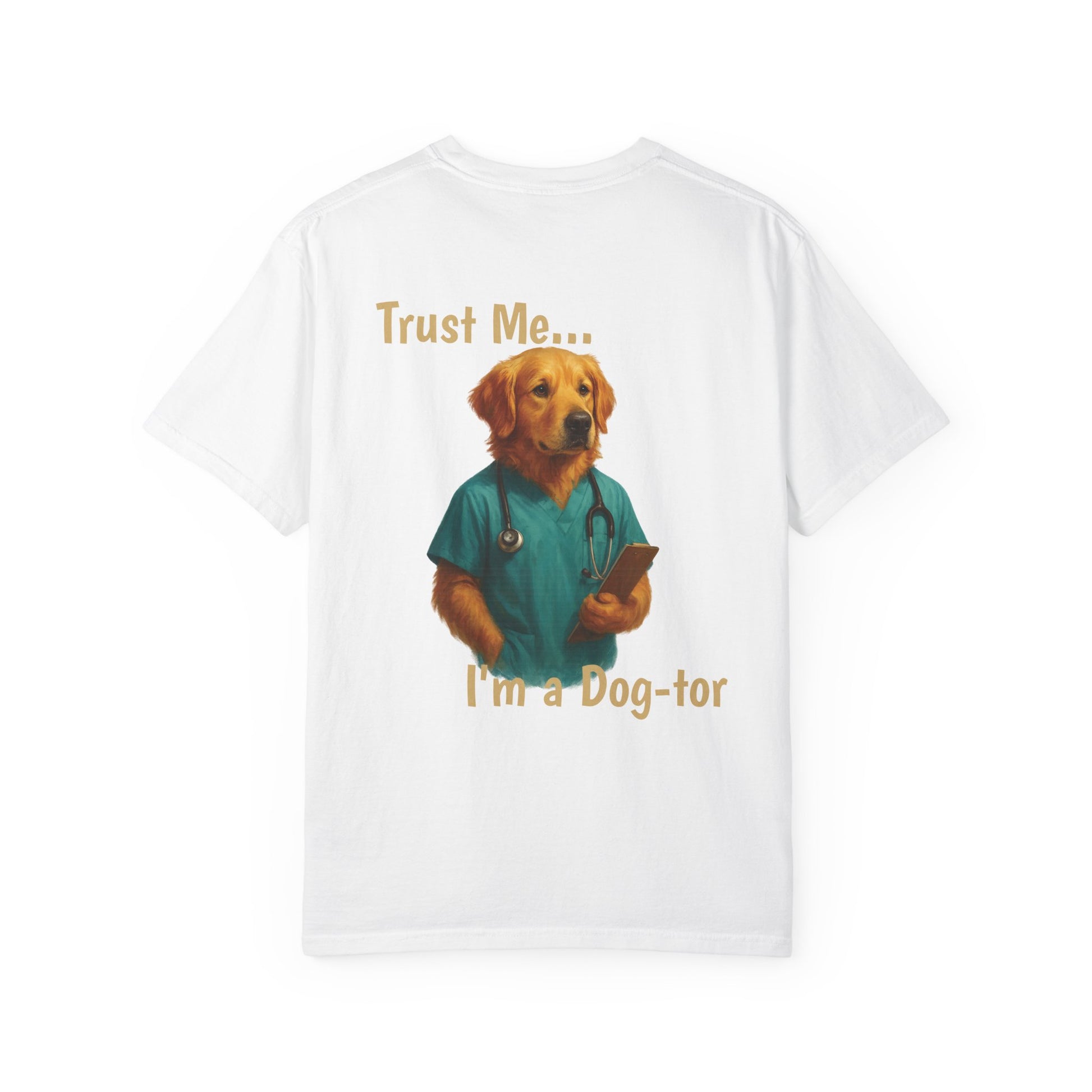 Featuring a front-facing golden retriever holding a stethoscope, paired with the witty back phrase “Trust Me, I’m a Dog-tor,” this shirt blends humor, heart, and the signature Stay Golden aesthetic.