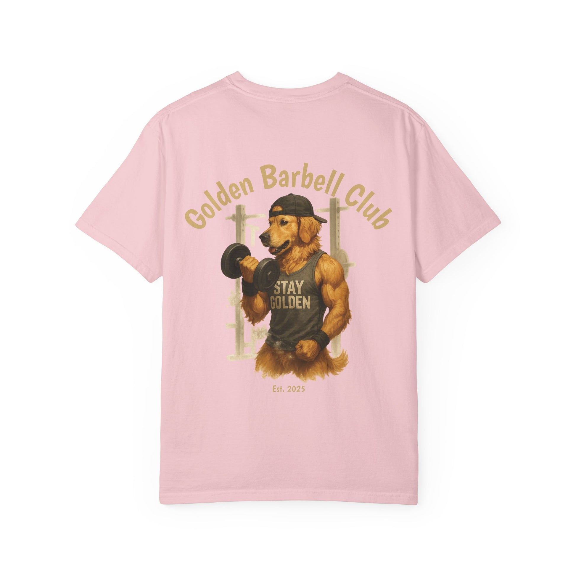 The Gym Bro Barbell Golden Tee is built for the lifters, grinders, and early-morning “one more rep” warriors who bring golden retriever energy to every workout.