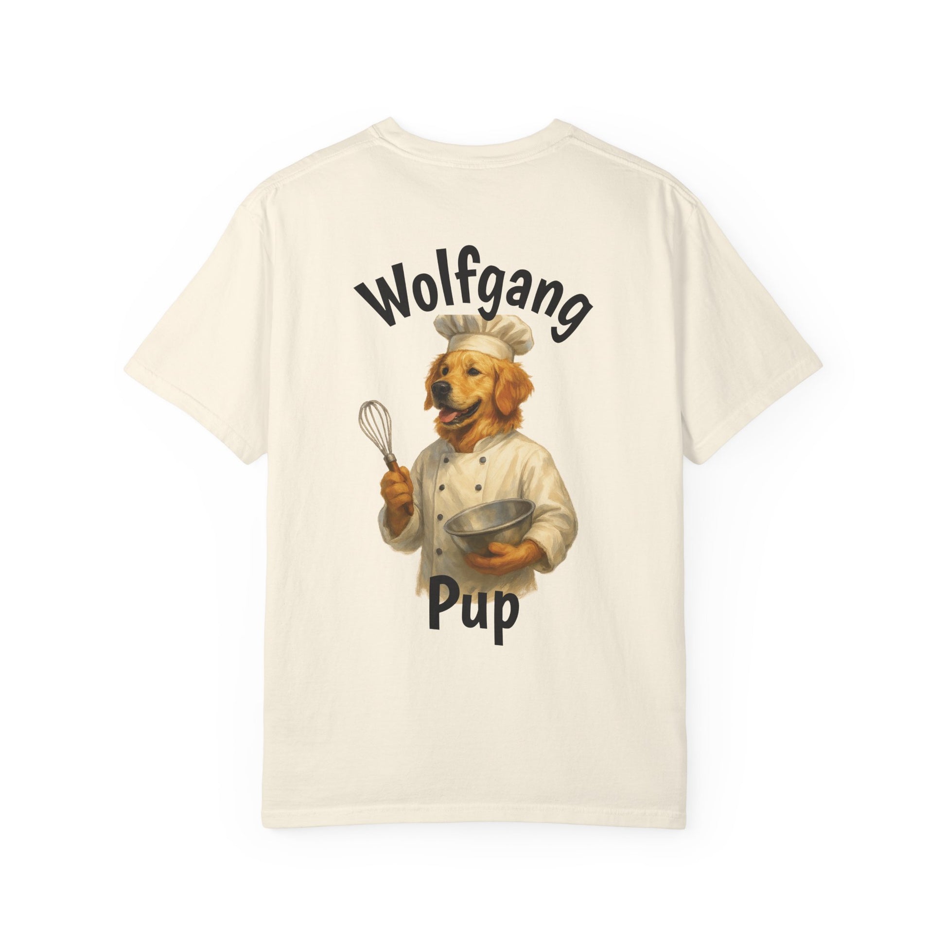 The Wolfgang Pup Tee brings a warm, playful twist to kitchen creativity with a golden retriever chef who steals the spotlight — whisk in mouth, bright eyes, and the kind of culinary confidence only a good boy can pull off.